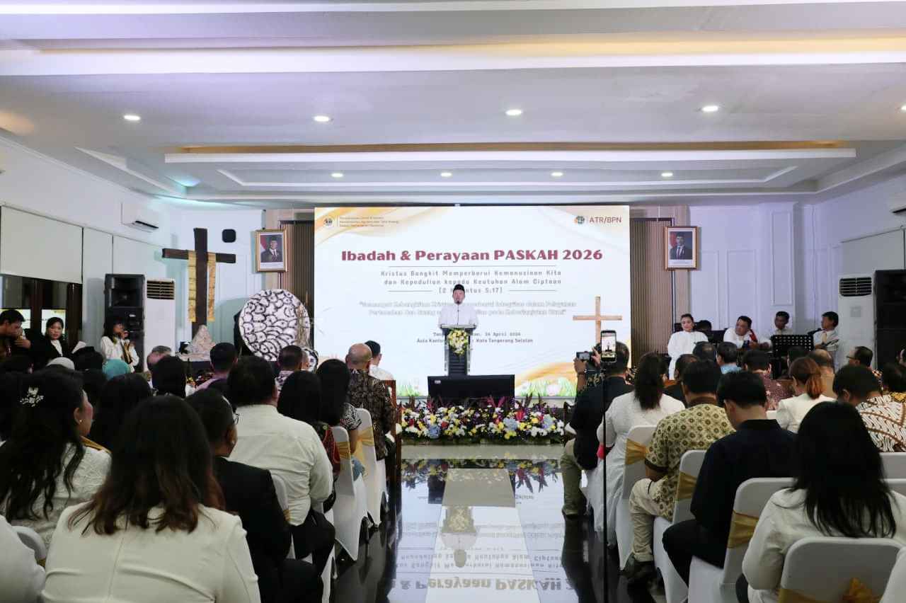 “Saudara-saudari sekalian, yang butuh Paskah, yang bangkit itu tidak hanya Yesus Kristus. Bangsa Indonesia itu juga butuh Paskah. Jadi semangat dan spiritnya Paskah itu bukan hanya spirit secara fisik. Tapi ada spirit kebangkitan secara cita-cita,” ucap Menteri Nusron dalam kegiatan yang berlangsung secara daring dan luring di Aula Kantor Pertanahan Kota Tangerang Selatan.