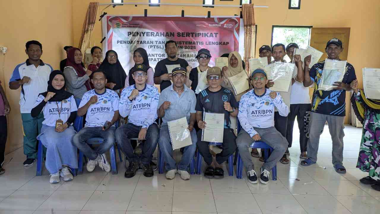 Morotai, Koridorindonesia.id– Kantor Pertanahan Kabupaten Pulau Morotai melaksanakan kegiatan Penyerahan Sertipikat Pendaftaran Tanah Sistematis Lengkap (PTSL) Tahun Anggaran 2025 yang berlangsung di Kantor Desa Wayabula, Kecamatan Morotai Selatan Barat pada Selasa (21/10/2025).