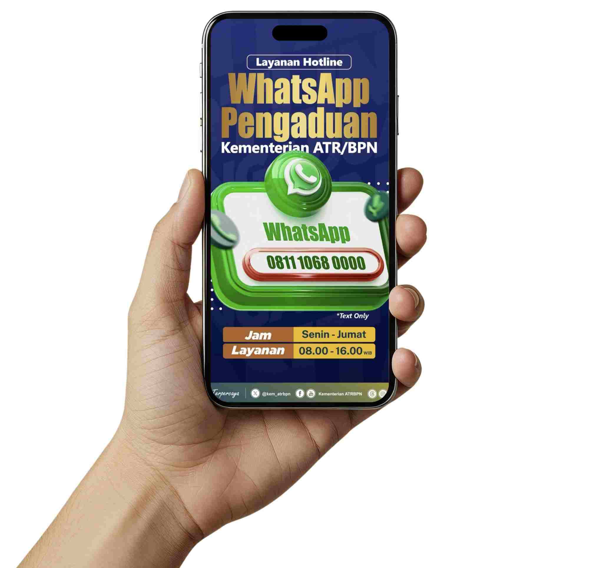 Saat ini, ada empat kanal resmi pengaduan yang disediakan Kementerian ATR/BPN, yaitu Hotline WhatsApp Pengaduan dengan nomor 0811-1068-0000; email resmi pengaduan melalui surat@atrbpn.go.id; loket persuratan untuk pengaduan tertulis dengan dokumen pendukung; dan SP4N-LAPOR! sebagai platform nasional pengelolaan pengaduan masyarakat.