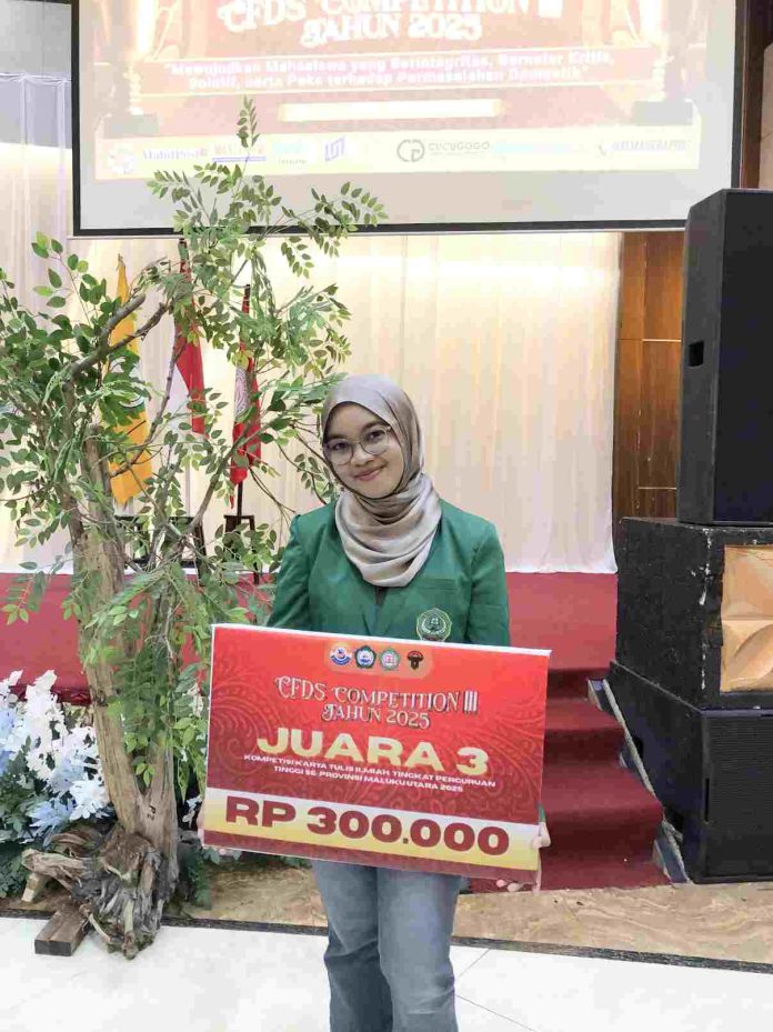 Ternate, Koridorindonesia.id – Mahasiswi Institut Agama Islam Negeri (IAIN) Ternate kembali mencatat prestasi gemilang di ajang ilmiah luar kampus. Nurlela Sarif, mahasiswi semester 5 Program Studi Manajemen Keuangan Syariah Fakultas Ekonomi dan Bisnis Islam, meraih juara 3 dalam Lomba Karya Tulis Ilmiah (KTI) yang diselenggarakan oleh UKM CFDS Fakultas Hukum Universitas Khairun (Unkhair ) Ternate. Pencapaian ini tidak hanya membanggakan kampusnya, tetapi juga menjadi wujud dedikasi dia untuk mengangkat isu ekonomi di daerahnya.